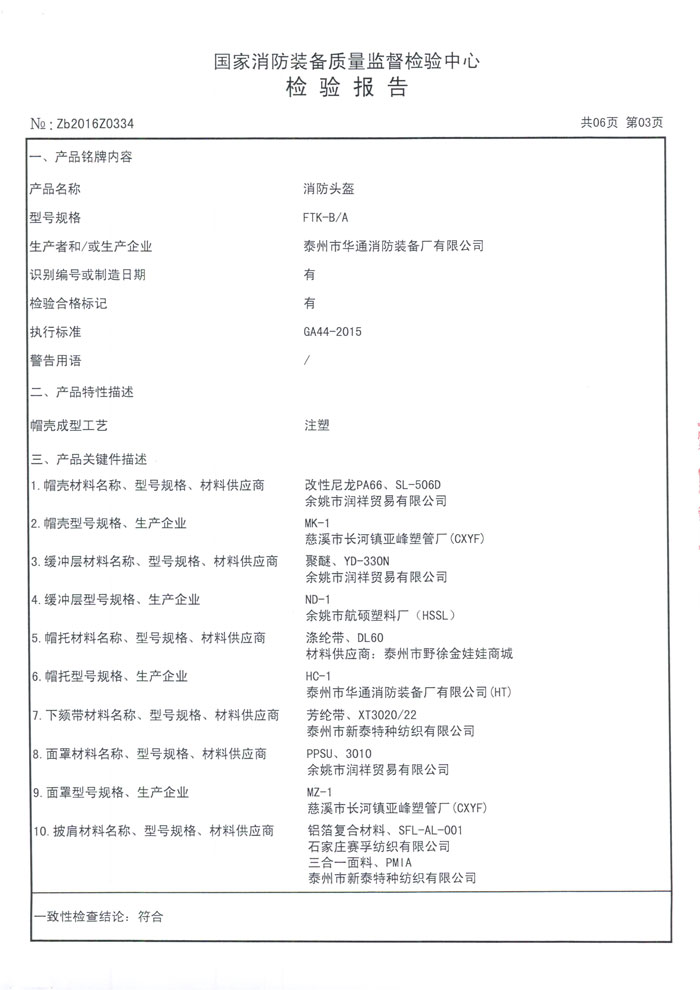 華通消防新型消防頭盔FTK-B/A符合GA44-2015標(biāo)準(zhǔn),CNCA-C18-04:2014《強(qiáng)制性產(chǎn)品認(rèn)證實(shí)施規(guī)則 消防裝備產(chǎn)品》,CCCF-XFZB-01《強(qiáng)制性產(chǎn)品認(rèn)證實(shí)施細(xì)則 消防裝備產(chǎn)品 消防員個(gè)人防護(hù)裝備產(chǎn)品》。沖擊吸收性能:最大沖擊力≤3780N,帽殼沒(méi)有碎片脫落,帽托亦沒(méi)有損壞和斷裂,帽箍于帽殼的連接機(jī)構(gòu)沒(méi)有損壞和斷裂??箾_擊加速度性能:帽頂部最大沖擊加速度≤150gn;帽前部最大沖擊加速度≤400gn;帽側(cè)部最大沖擊加速度≤400gn;帽后部最大沖擊加速度≤400gn。耐燃燒性能在火源離開(kāi)帽殼后,帽殼火焰在5s內(nèi)自熄,沒(méi)有火焰燒透到帽殼內(nèi)部跡象,帽殼沒(méi)觸及頭模,且無(wú)明顯變形,帽箍、帽托、緩沖層和下頦帶均無(wú)明顯變形和損壞,任何部件都無(wú)被引燃或融化。