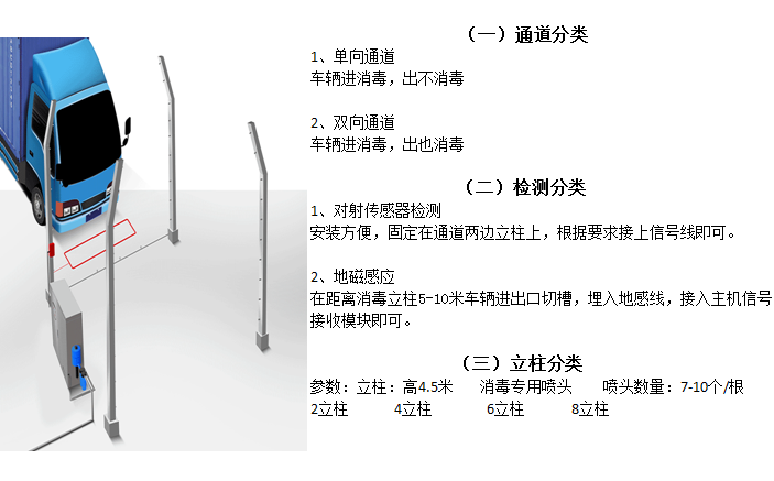 車輛消毒通道主要用途為預(yù)防及防治流感、口蹄疫、霍亂、流行性疾病等病毒病菌的傳播,擴(kuò)散,需要在消防站、防疫站、省道、國(guó)道、高速公路、城鄉(xiāng)交接處、出入境檢疫站、無(wú)害化處理中心等處對(duì)貨物運(yùn)輸車輛、消防車輛及其它進(jìn)出通行的車輛進(jìn)行徹底的消毒,防止車輛外表面帶來(lái)的病原體擴(kuò)散傳播,達(dá)到進(jìn)出車輛防疫消毒目的。本消毒通道在消毒方式上采用高壓沖擊噴霧技術(shù),符合SN/T1333-2012《入出境汽車及其他車輛消毒規(guī)程》標(biāo)準(zhǔn)要求。